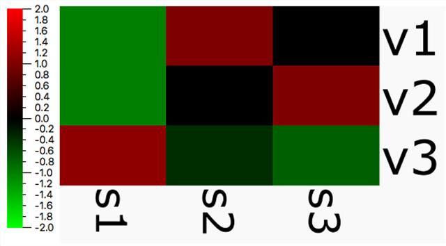 Notice that s2v2 and s3v1 are black since their normalized values are 0 and that the positive values are shades of red and the negative values shades of green.